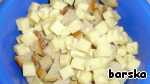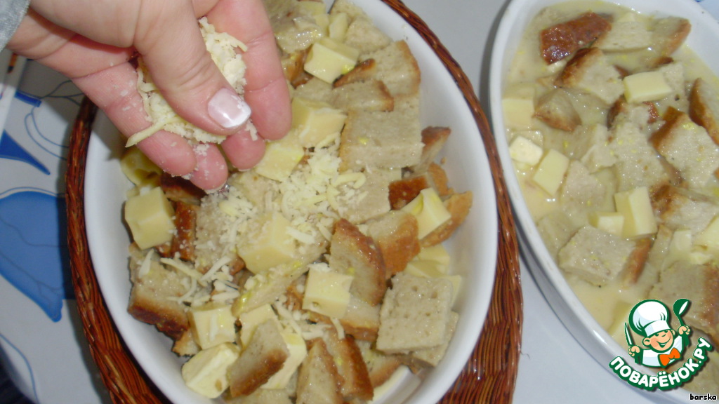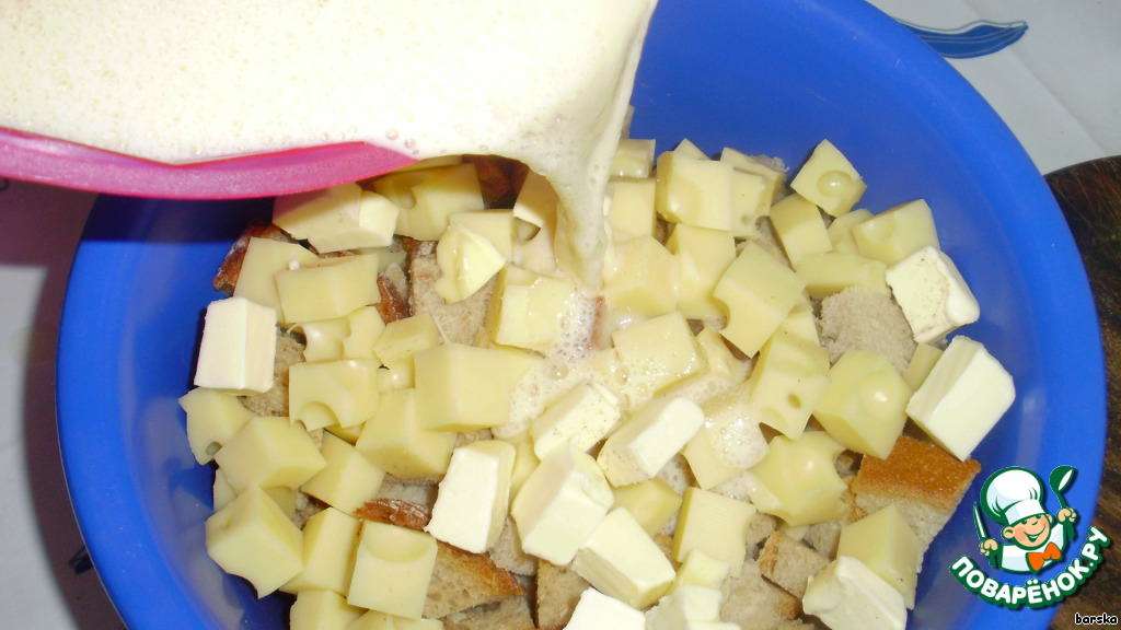 Влить яично-пивную смесь в миску с хлебом и сыром, перемешать. Дать постоять 2-3 мин.