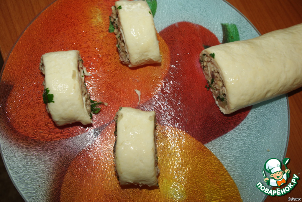 -Разрежьте рулет на небольшие части (3-4 см шириной)