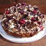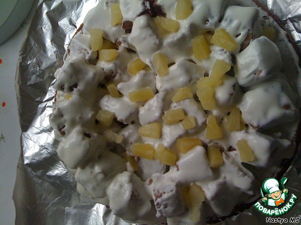 ... и выложить горкой на целый корж, чередуя с кусочками ананаса и орехами.