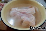 - Далее мясо снимаем с костей, а кожу помещаем в холодную воду.