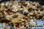 - В масле, что осталось после обжаривания мяса, обжариваем лук и грибы до красивого цвета.
