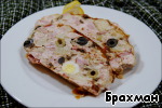 С сухарей сливаем молоко, не отжимая. Добавляем фарш, оливки и маслины целиком. Плюсуем яйца, грибы с луком и грудинку. Перемешиваем.