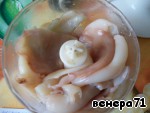 Кальмары почистить и измельчить блендером или мясорубкой.