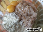 Кальмарный фарш посолить, поперчить, добавить два желтка, муку, манку - перемешать