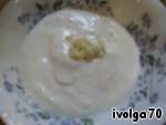 Теперь в сметану или йогурт выдавливаем зубчик чеснока и солим.