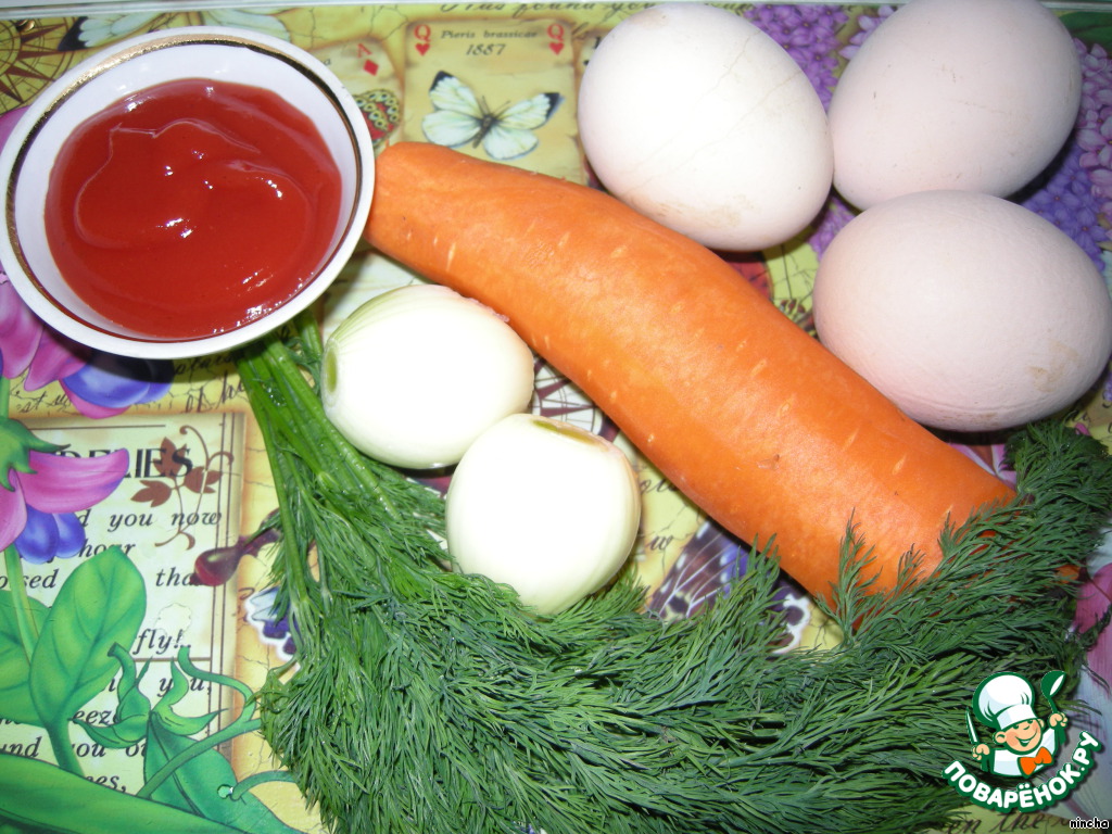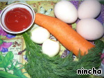 Желток смешиваем с рубленым луком, морковкой, укропом, добавляем томатный сок. -