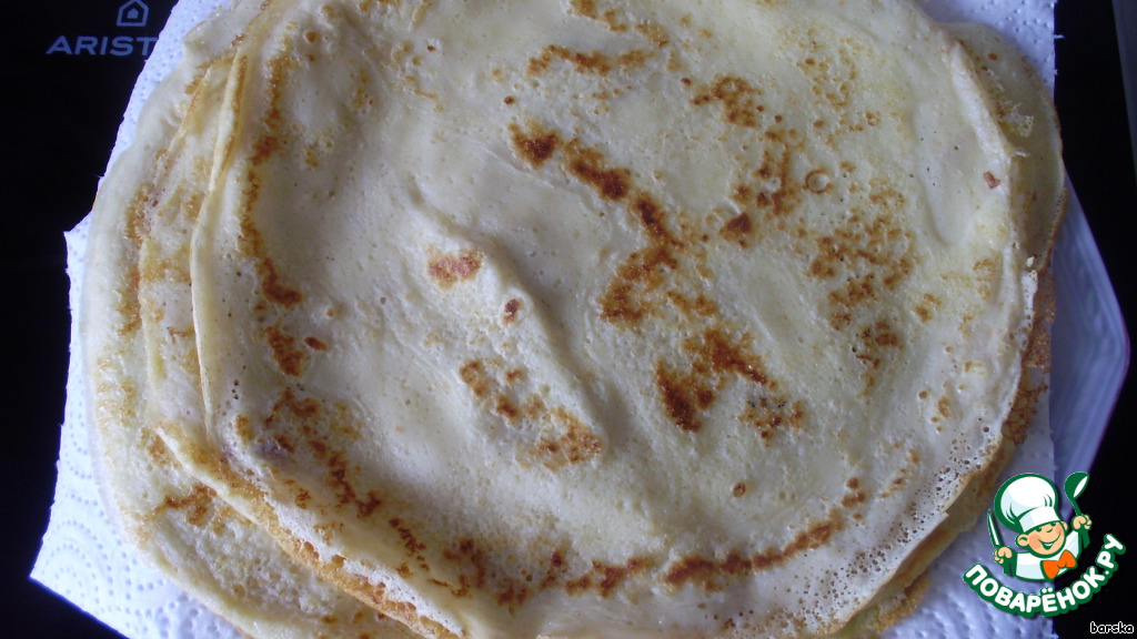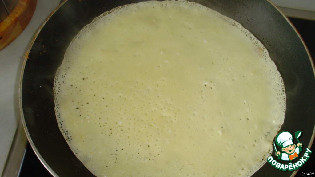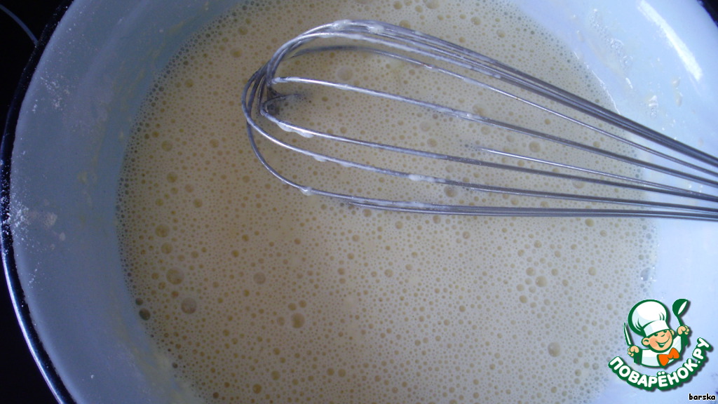 готовим тесто из молока, яиц, щепотки соли и 1 ч.л. растительного масла