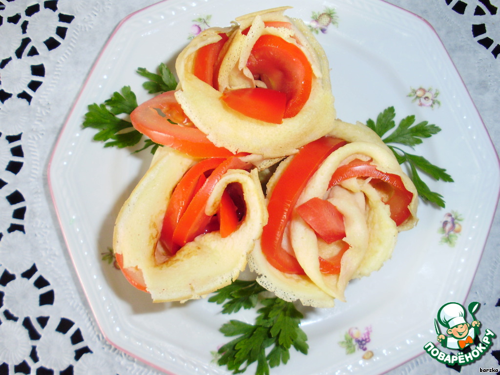 Розы: сложенный пополам блинчик, а внутри - нарезанный тонкими дольками помидор -