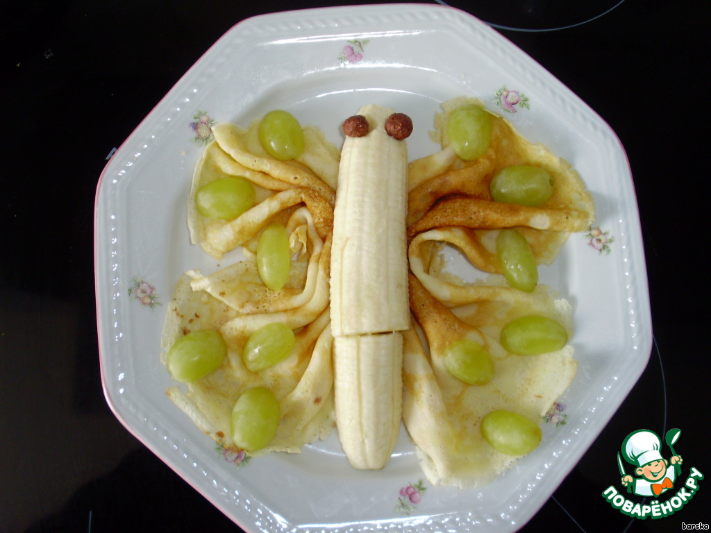 Бабочка: блины выложить веером, дополнить фруктами (банан, виноград)