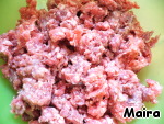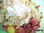 В миске смешать измельченное мясо, картофель, лук, яйцо, панировочные сухари, посолить, поперчить.