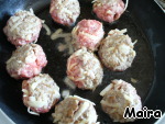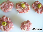 Из полученного фарша сформировать лепешки. В центр каждой положить оливку и сделать небольшие котлетки размером с грецкий орех.
