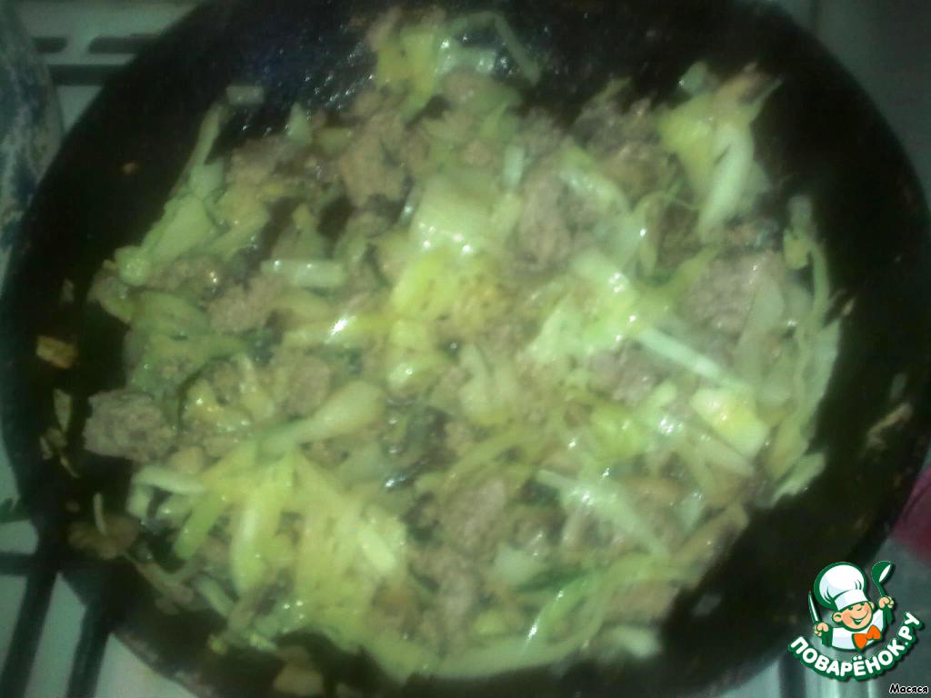 Второй вариант - шампиньоны режем, капусту шинкуем, фарш обжариваем и добавляем к нему капусту и грибы, тушим 10 минут.