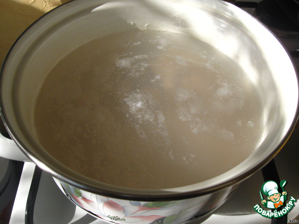 Мясо заливаем водой (2л) и варим на среднем огне. -