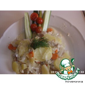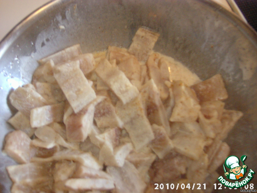 Рыбу нарезать небольшими кусочками, полить лимонным соком,