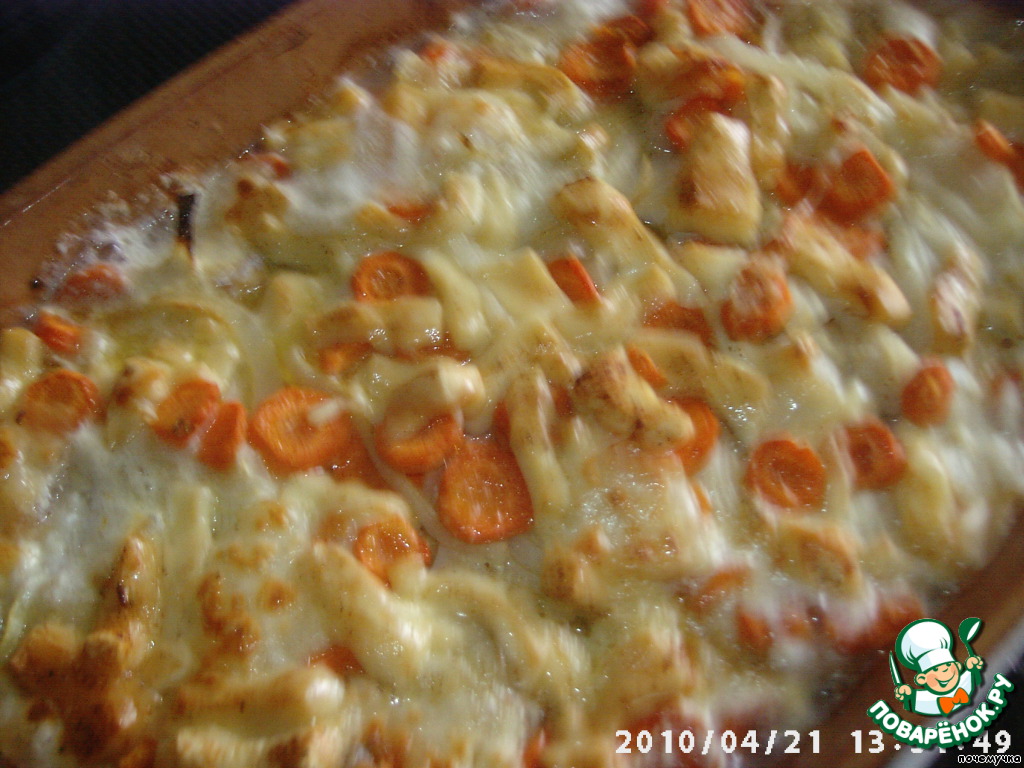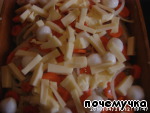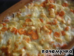 Последним слоем положить кусочки сливочного масла и сыра. Запечь в духовке.
