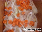 Далее положить 1/2 части рыбы, лук и морковь, тоже 1/2 порции. -