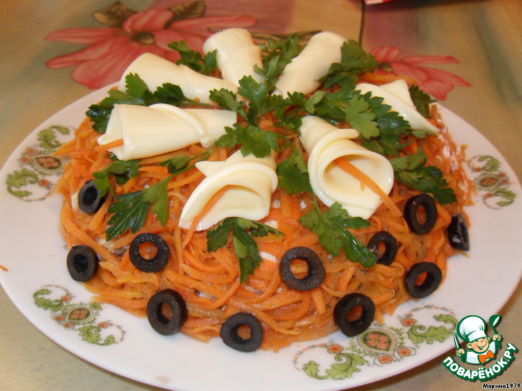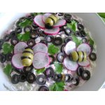 Делаем 7 таких цветочков. И украшаем наш салат этими цветочками, зеленью и колечками из маслин. -