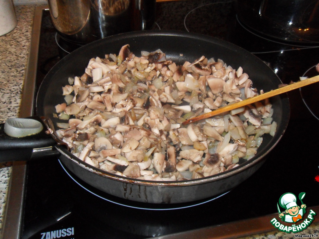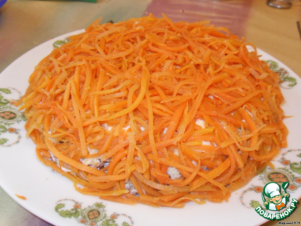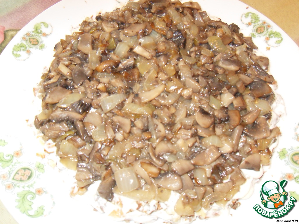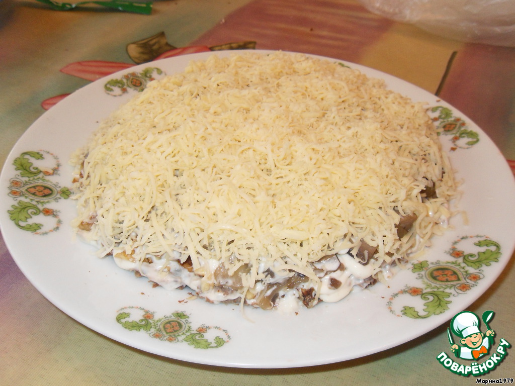 На орехи выложить шампиньоны с луком, тоже немного смазать майонезом