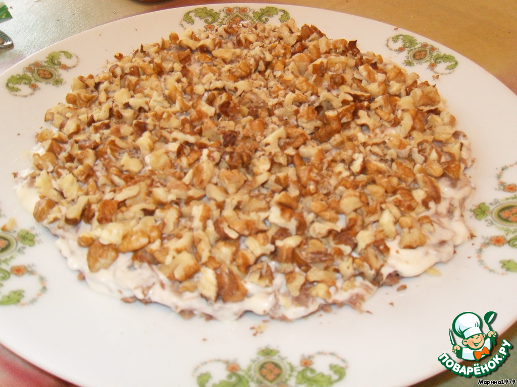 Затем мелко рубленные грецкие орехи, смазать майонезом