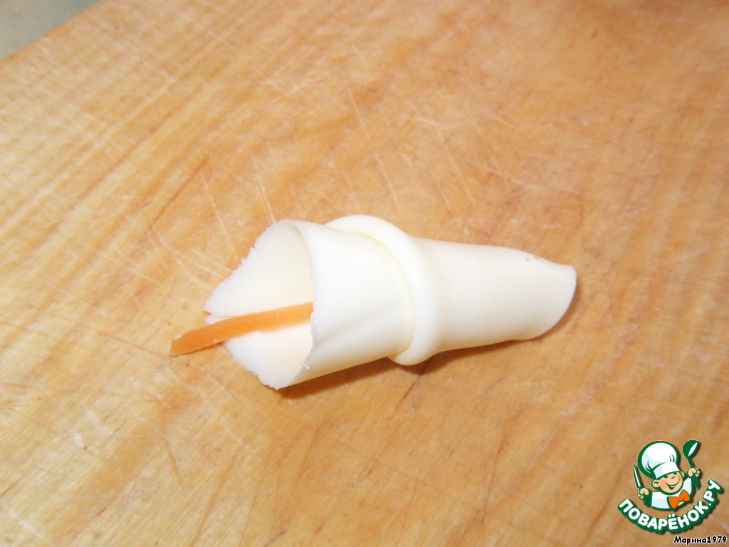 Сворачиваем треугольник в цветок, серединка - из корейской моркови.