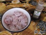 Обвалять кубики мяса в смеси муки, соли, перца и мускатного ореха. -