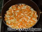 Морковь и корень сельдерея очистить и нарезать соломкой. Выложить на сковороду, нагретую с растительным маслом и обжарить.