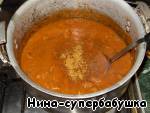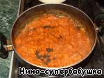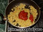 Добавить у луку муку, перемешать. Затем добавить томат-пасту. Все вместе немного прожарить.