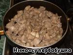 Выложить мясо в кастрюлю к спассерованным овощам.