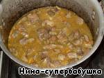 Вылить содержимое сковороды в кастрюлю с мясом.