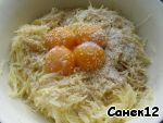 В полученную массу добавить желтки, соль, перец, кунжут, специи.