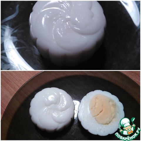 Яйца сварить вкрутую, чтобы не обжечь руки, немного полить холодной водой, очистить и положить в квадратик горячее яйцо острым концом вниз и придавить, подержать 1-2 минутки.