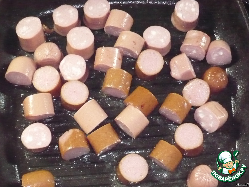 Сосиски нарезать, как нравится, и обжарить на сильном огне 3-5 минут.