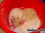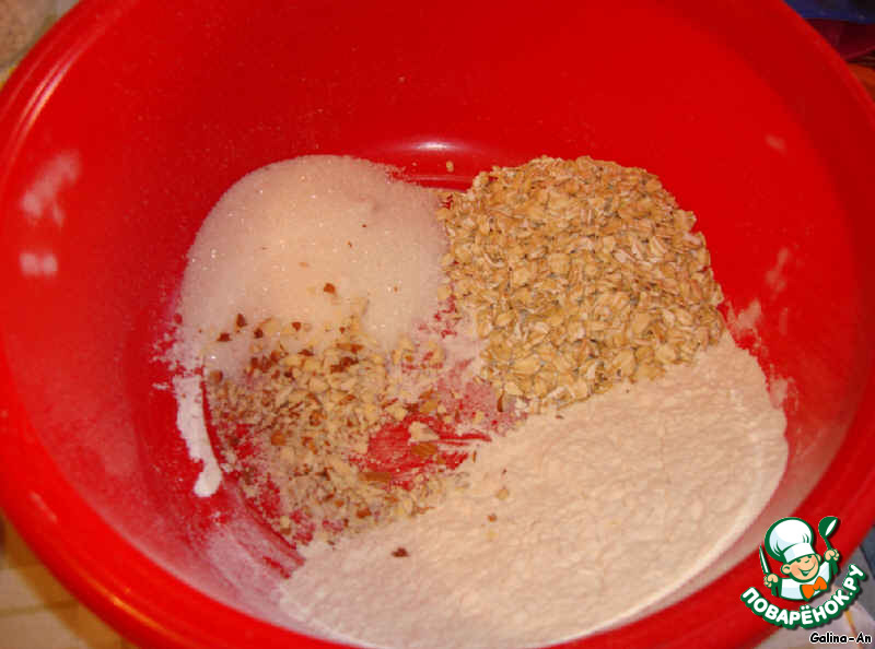 • В большую миску всыпаем муку, овсяные хлопья, сахар, орехи