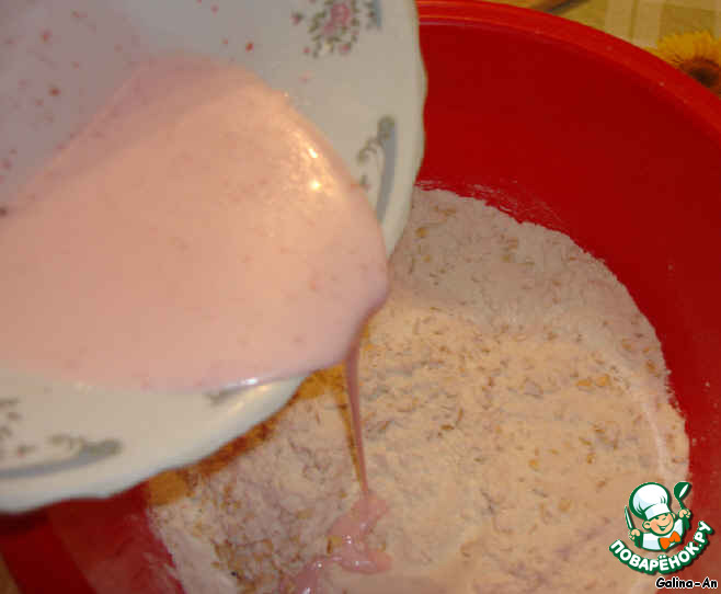 • Вливаем получившуюся смесь в наше "сухое тесто"