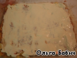 Сыр мягких сортов смешать со сливками, добавить чеснок, специи, промазать остывший корж