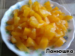 Пока обжаривается курочка, из болгарского перца удалить семена, нарезать кубиками, выложить на сковороду к курице.
