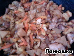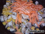 Морковь нарезать соломкой и обжарить с курицей и перцем.