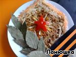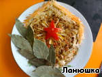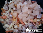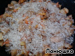Засыпать рисом, добавить немного воды, накрыть крышкой и тушить еще минут 10-15.
