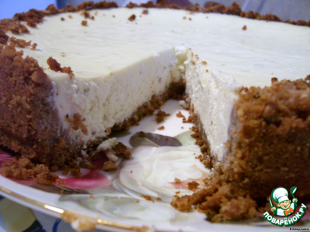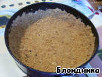 Выкладываем в разъемную форму (23 см диаметром), утрамбовываем, формируя бортики. Ставим в духовку, разогретую до 170 градусов на 10 минут, чтобы основа «схватилась».