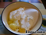 Для крема взбиваем творог с яйцами, сметаной, сахаром, ванилином.