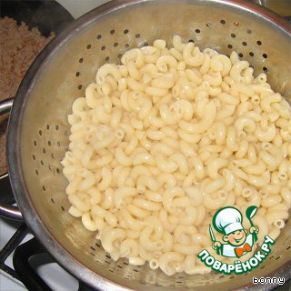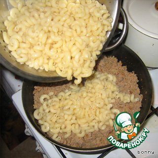Исторически блюдо образовалось так: варилось мясо, бульон использовался для супа, а варёное мясо перекручивалось в мясорубке, поджаривалось с луком и добавлялось к макаронам. Флотская, военная, экономная рецептура