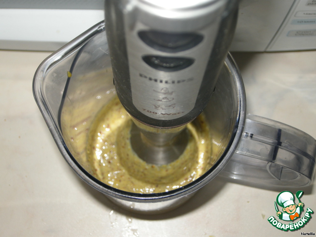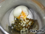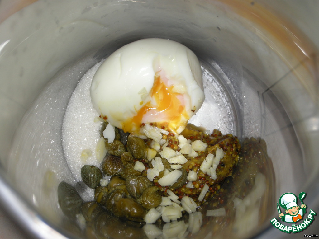 Яйцо, сваренное в мешочек, 1 ч.л. сахара, несколько каперсов, 1 ч.л. горчицы, 1 зубчик чеснока - взбить блендером. -