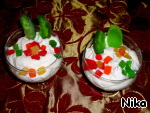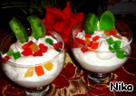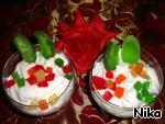 Сливки взбились, разложить в креманки, украсить (чем угодно - ягодами, тёртым шоколадом и др.) цукатами, которые предварительно были в тёплой воде 10 минут