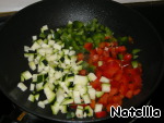 Цуккини, перец красный и зеленый режем мелкими кусочками, слегка обжариваем сначала в сухой сковороде, а затем в оливковом масле.