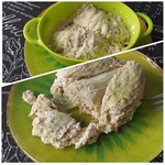Капусту разобрать на листочки, верхнюю часть листика нарезать на небольшое полоски. Положить в горячую воду на 1 минуту, затем в холодную, обсушить на бумажных салфетках.