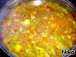 Немного обжарить морковь, лук и три ложки томатной пасты. Когда мясо сварится, выложить в кастрюлю все овощи - и жареные, и свежие.