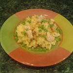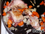 Пока варится крупа, обжарить лук, морковь. К зажарке добавить кусочки курицы или филе. Слегка обжарить, потом добавить немного воды и тушить.