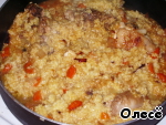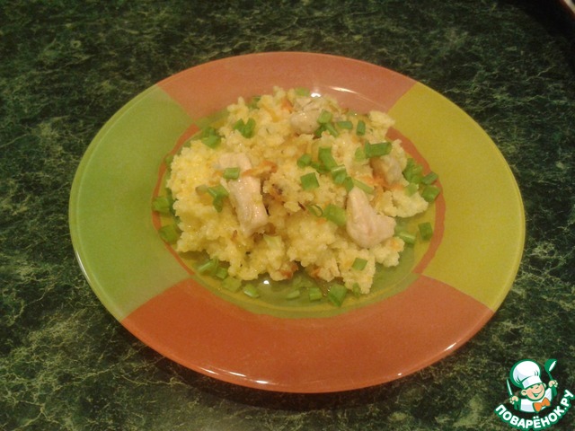 Когда курица будет готова, каша уже сварится. Все соединить на сковороде, посолить, добавить специи. Потомить еще минут 5.