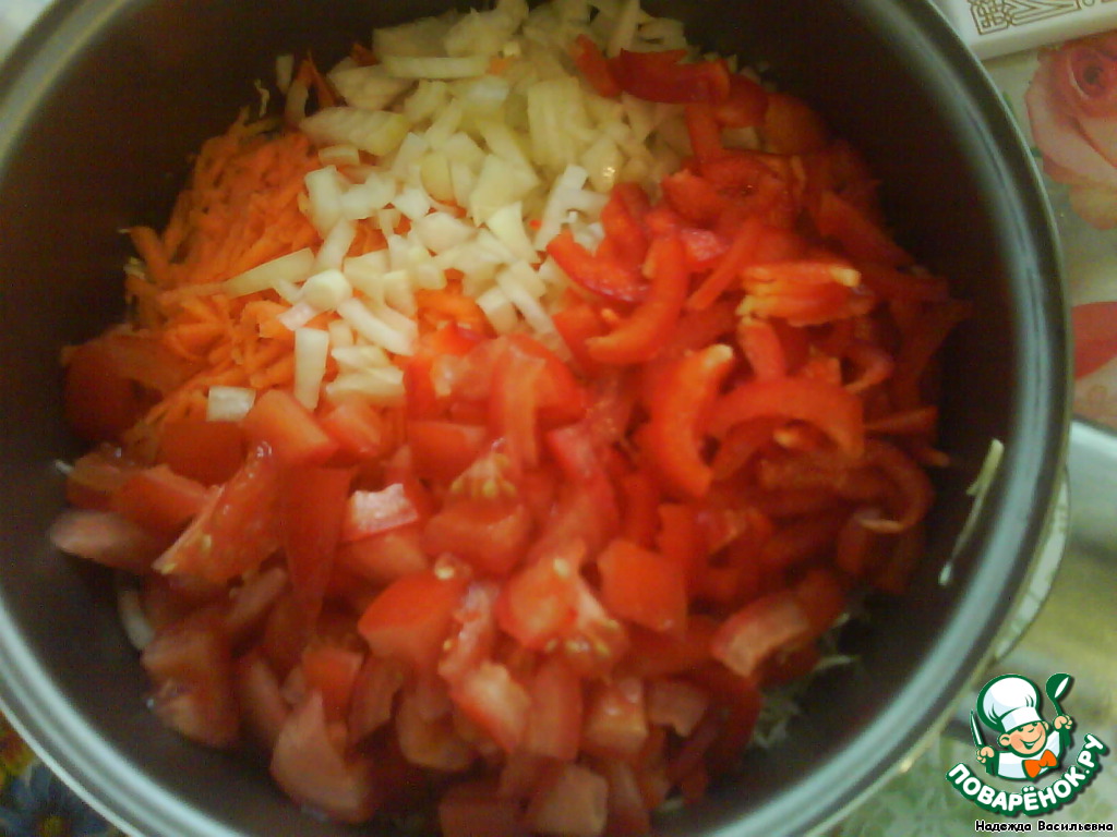Нарезать перец и помидор и также добавить к остальным овощам. Когда все овощи оказались в кастрюле, солим, добавляем чуть-чуть воды (самую малость, так как овощи дадут свой сок), растительное масло(примерно 2 ст. ложки). Все перемешиваем. Ставим на небольшой огонь и тушим.