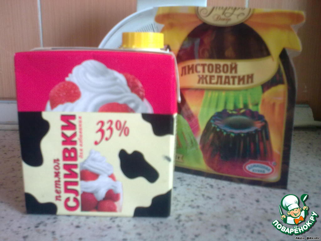 Желатин замочить в воде. Затем нагреть до растворения. Смешать с ананасовым пюре. 400 г. сливок взбить. Можно добавить сахар по вкусу.